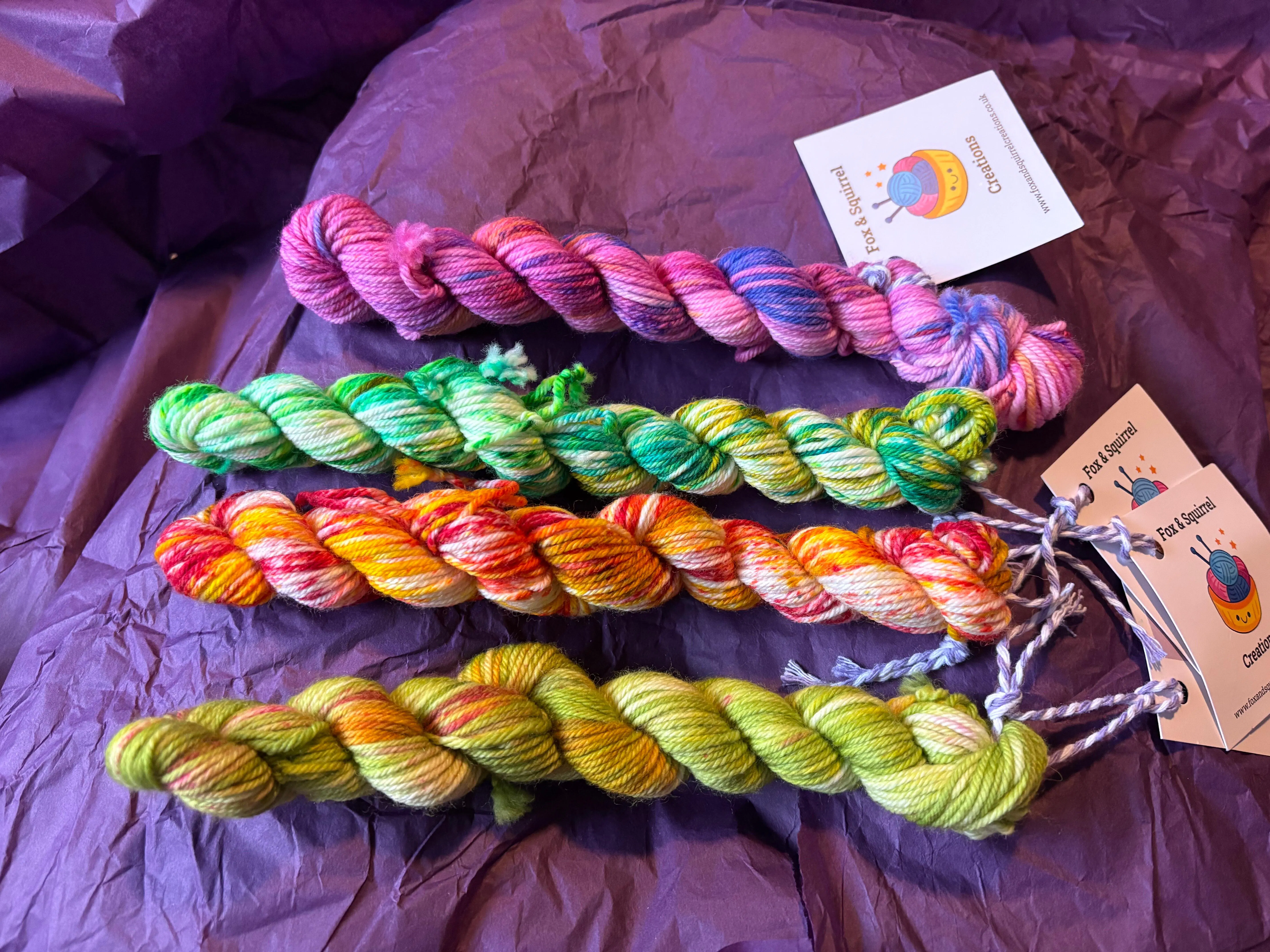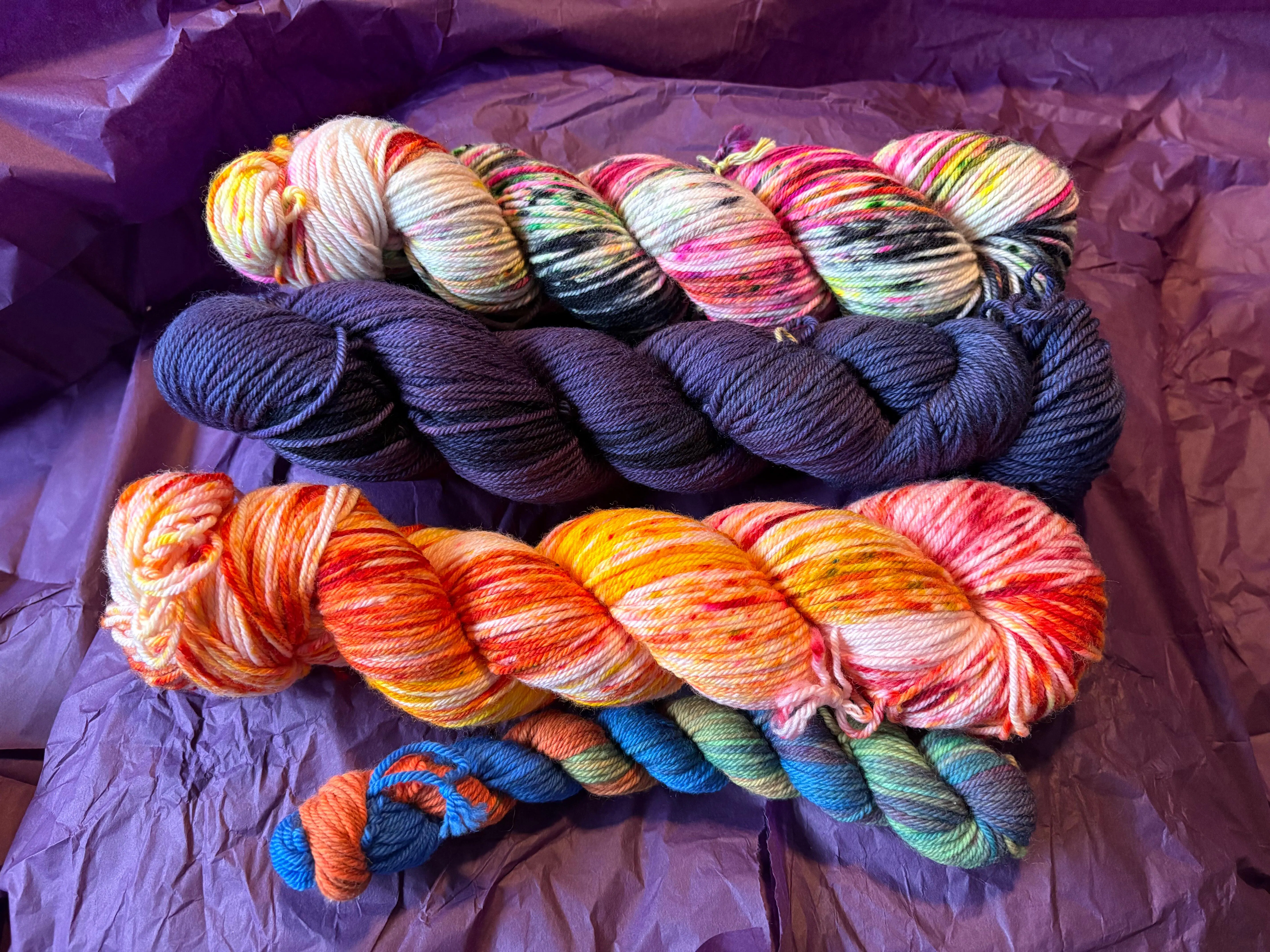 These lovely bundles contain three 100g skeins of hand-dyed Merino/Nylon Yarn (75% superwash Merino & 25% Nylon), with additional surprises!! Example bundle is pictured and all the bundles are different combinations, so no two are the same.